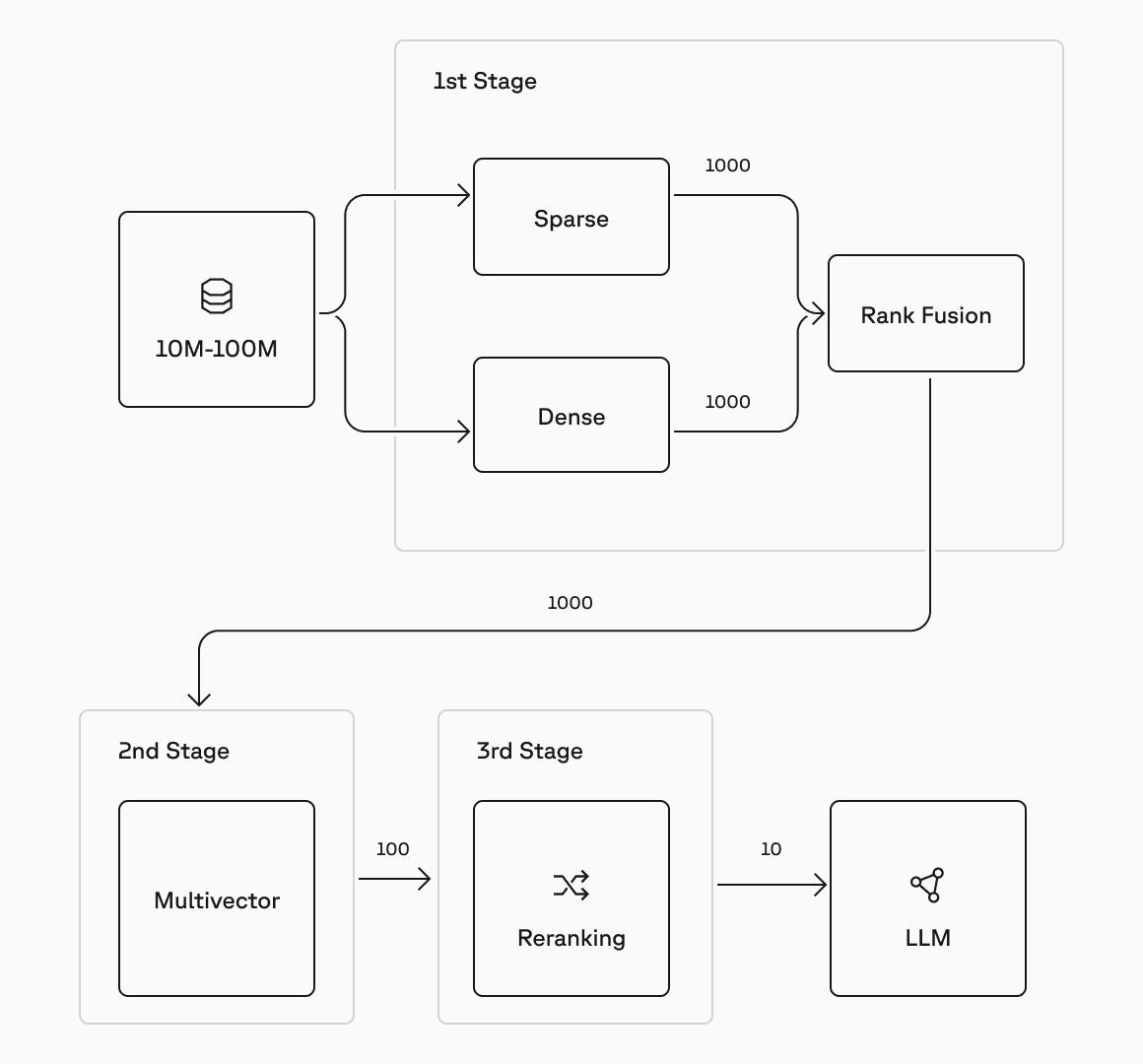 The key here is that each stage of retrieval progressively improves and shrinks the candidate results so that the following stage has less, but more accurate, data to spend its more expensive resources on. This lets you balance speed and quality dynamically depending on the use case, latency tolerance, or priority (e.g., relevance vs cost).
