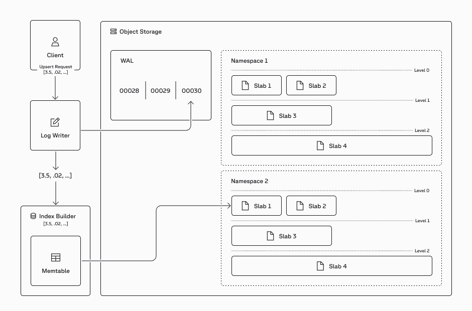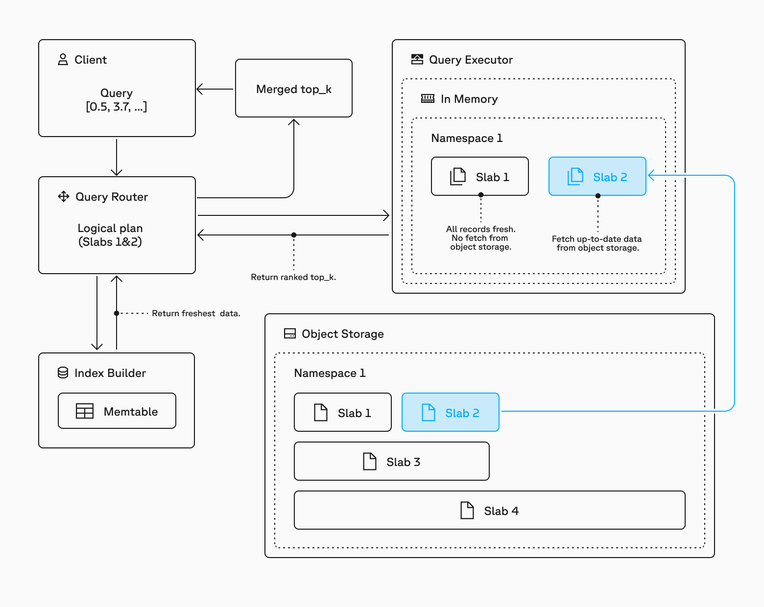 We completely persist data on blob storage for small namespaces, which represent the majority of agentic workloads. When a query arrives, relevant data is fetched and cached on-demand. This approach effectively decouples the amount of compute and SSD needed from the total data size, solving storage limitations for massive multi-tenant systems. Note that once the slab is cached, all subsequent queries are much faster because they don’t need to be fetched from blob storage.