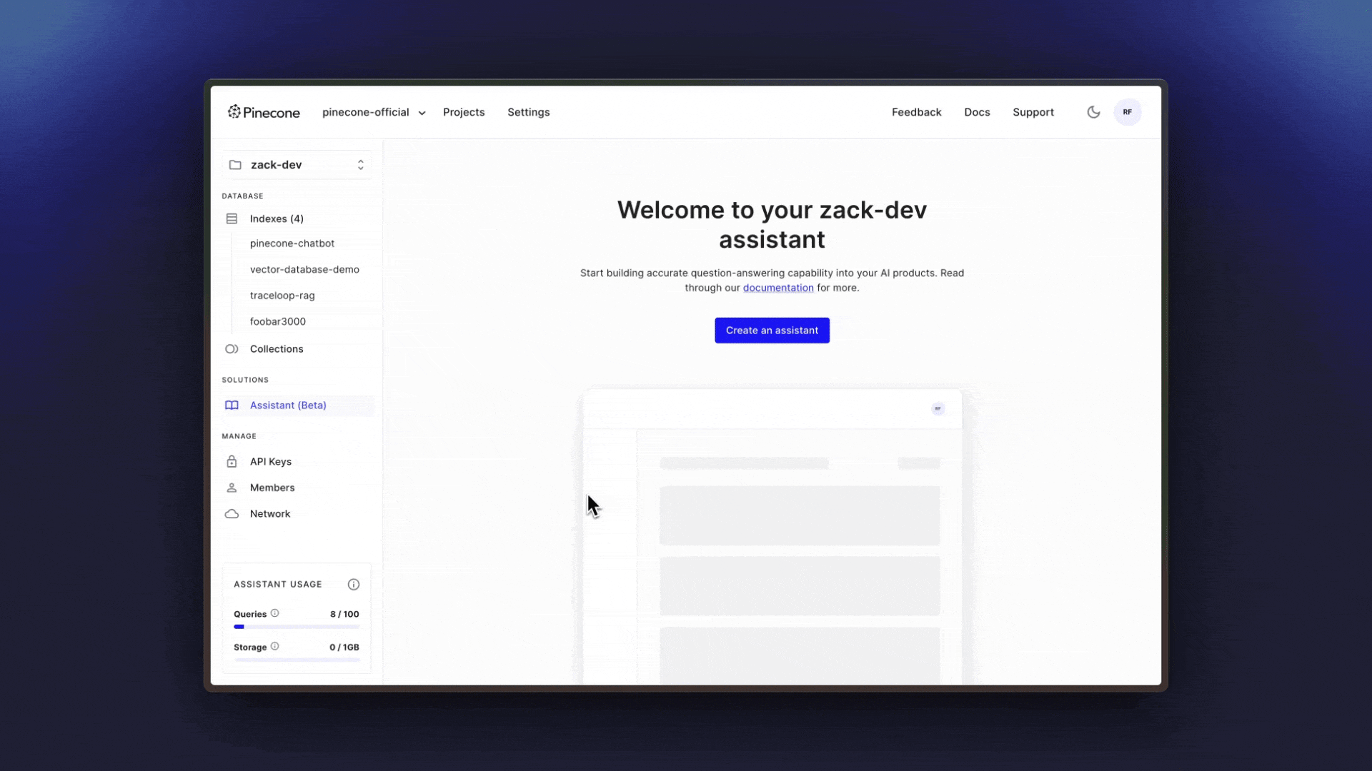 We’re releasing Pinecone Assistant in beta for developers to try and share their feedback. The starting limits are 1GB of file storage and 100 queries per month, but they may change during the beta period. You can expect some rough edges but also rapid improvement based on your feedback.