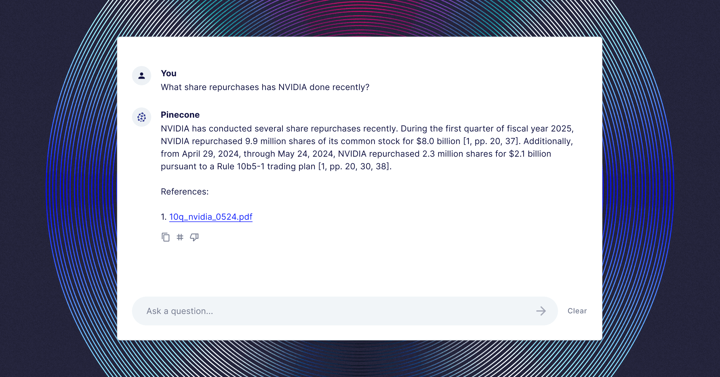 resp = finance_assistant.chat_completions(messages=[msg])All the infrastructure, operations, and optimization of a complex Q&A system are handled for you. That includes chunking, embedding, file storage, query planning, vector search, model orchestration, reranking, and much more. Pinecone Assistant leverages our enterprise-grade vector database and extends frontier models — starting with GPT-4o from Azure OpenAI Service with other models coming soon.