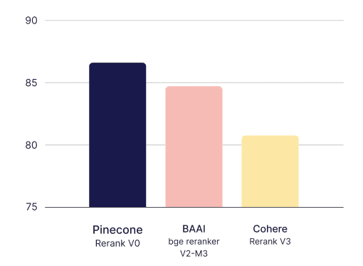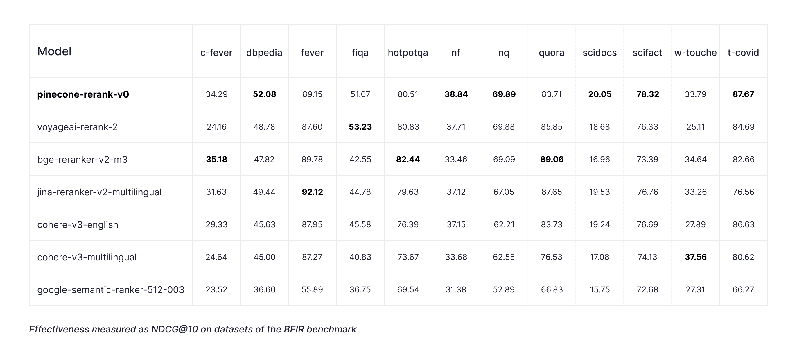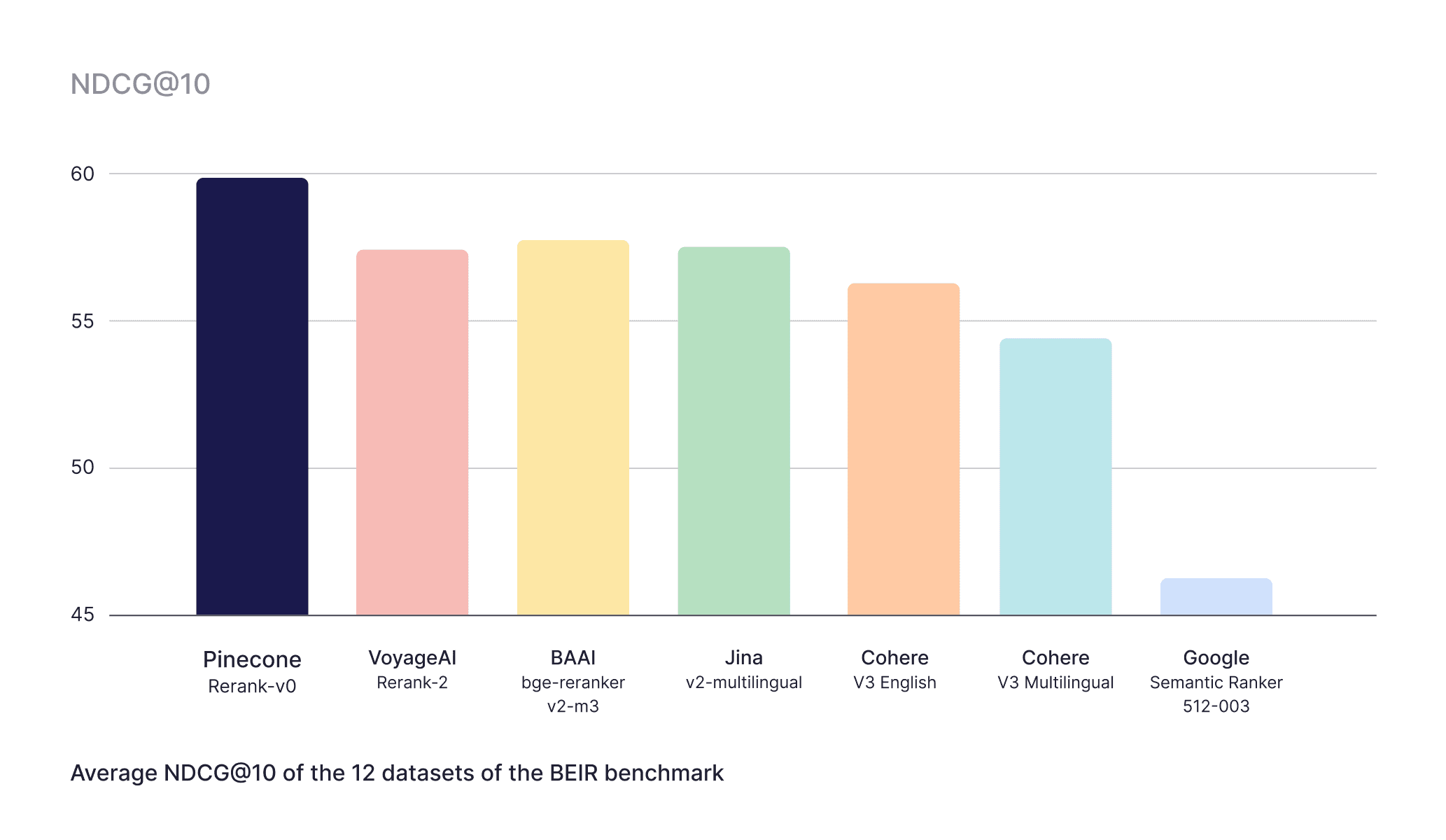 - Pinecone-rerank-v0 had the highest average NDCG@10, notably higher than the alternatives