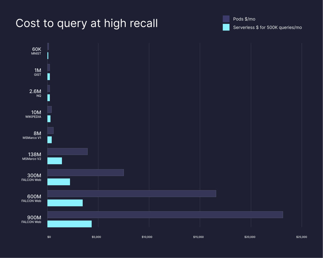 Here, we benchmarked what it costs to serve queries on the pod-based architecture vs Pinecone serverless across various datasets, keeping recall at least as high as the pod-based architecture.