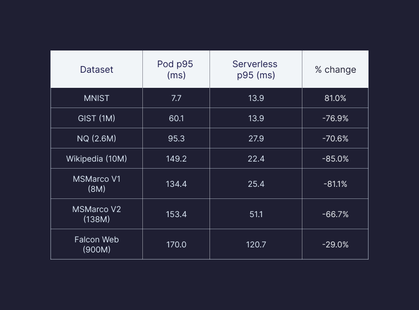 We collected some benchmarks that compare our pod-based architecture to Pinecone serverless. In due course, we will also release a benchmarking suite along with our methodology for benchmarking vector databases so anyone can reproduce these benchmarks and use them to compare other vector databases and traditional databases on the workloads that matter.