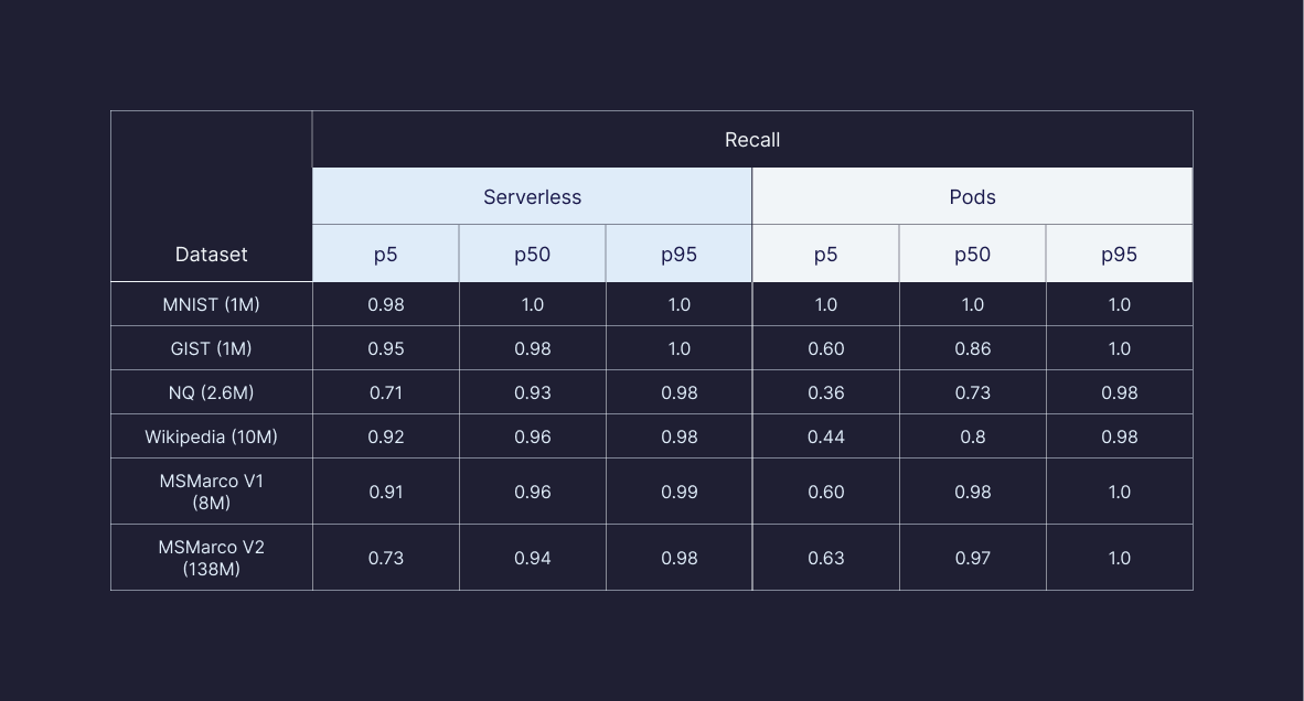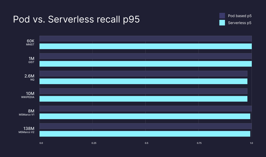 Our best gains came from improving many of our “worst case” recall performances. At p95 (the majority of calls), Serverless and pod-based return similar recall performance, but our worse-case performances (p50 and p5) are significantly improved.