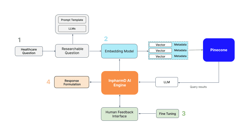 With the vector embeddings stored in Pinecone, the InpharmD Sherlock works as follows: