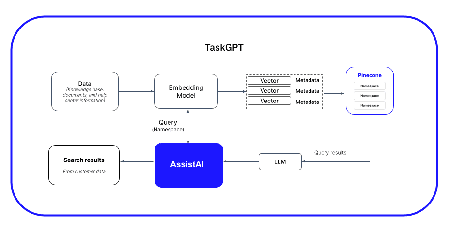 The team stores the chunks in a S3 bucket, and the vectors, along with metadata like the document name, are stored in Pinecone. Additionally, Pinecone namespaces secure the clients’ information while accessing different environments. Within seconds, an AssistAI bot is created using a proprietary RAG based solution, enabling the TaskUs’ support teammate to access the fintech client’s knowledge.