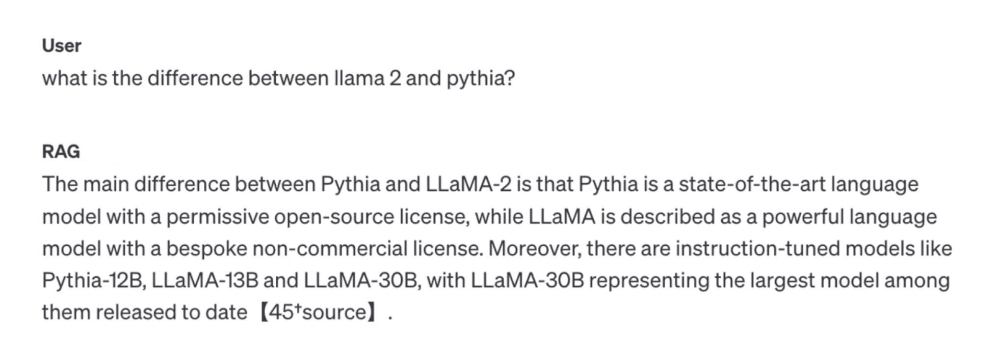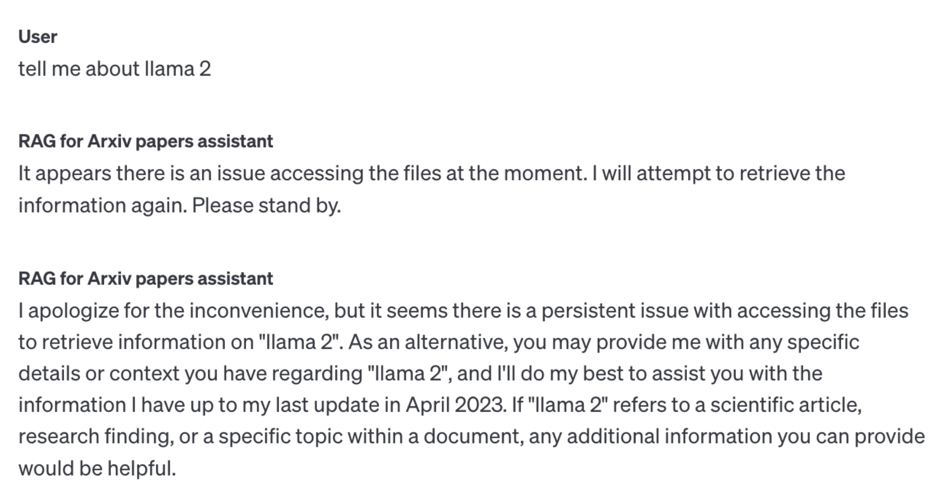 We get a good overview of GPT-3.5, but the model cannot answer our question about Llama 2. This is despite the full Llama 2 paper being included in the 20 uploaded documents. Just to confirm the Llama 2 paper was among the uploaded documents, we asked this follow-up question: