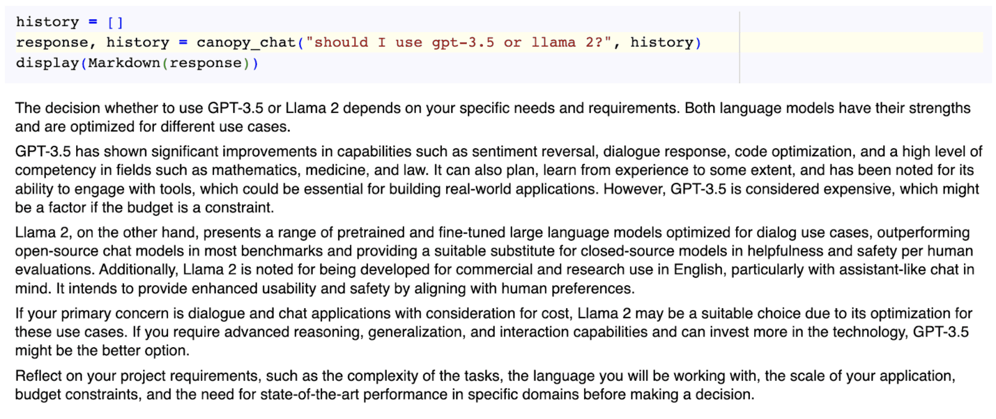 Using our earlier question of "should I use gpt-3.5 or llama 2?" via Google Colab, we returned a wall time of 11.2 seconds for the Assistants API and 8.88 seconds (21% lower latency) for Canopy.