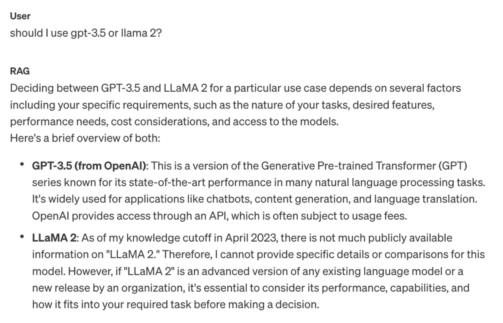 After switching to the smaller 20-document set for Assistants API and Canopy, we wanted to perform a qualitative assessment of retrieval performance. We began with a relatively simple question: "should I use gpt-3.5 or llama 2?"