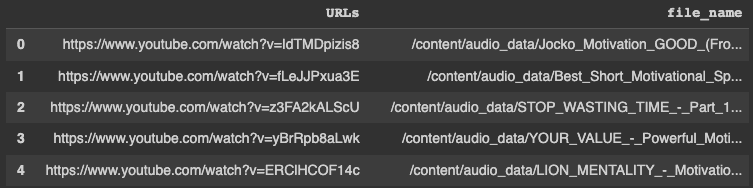 The following helper function video_to_audio() first downloads a video from YouTube and saves it as an MP3 audio file. Then it returns the name of the audio file that is later used within the metadata dataframe.