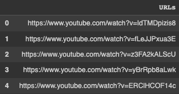transcription_df = pd.DataFrame(list_videos, columns=['URLs'])