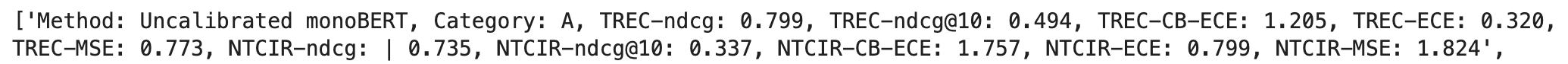 Method: Literal Explanation + BERT, Category: F, TREC-ndcg: 0.815*, TREC-ndcg@10: 0.529%, TREC-CB-ECE: 0.996°, TREC-ECE: 0.067*, TREC-MSE: 0.602" |, NTCIR-ndcg: 0.742, NTCIR-ndcg@10: 0.340, NTCIR-CB-ECE: 1.534", NTCIR-ECE: 0.355, NTCIR-MSE: 1.3307. Table 2: Ranking and scale calibration performance of baseline methods and our approaches on two scale calibration datasets\nTREC and NTCIR. Note that lower is better with calibration metrics (CB-ECE, ECE and MSE). Statistically significant improve-\nments over “Platt Scaling monoBERT” are marked with
